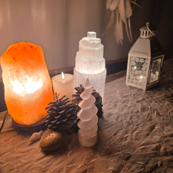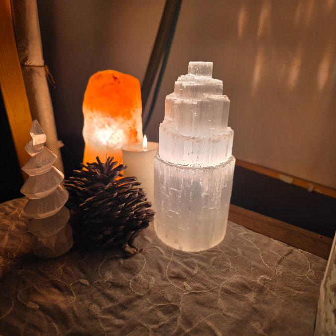 על הקריסטל והשפעתו: הסלנייט מתאפיין בתדר גבוה מאוד ומהיר, מה שמאפשר לו “לשבור” חסימות אנרגטיות בגוף ובמרחב. בתרבויות עתיקות האמינו כי הסלנייט מחבר בין עולם החומר לעולם הרוח, והוא שימש לעיתים קרובות להגנה על מבנים מקודשים – בדיוק כפי שמנורת המקדש עושה עבור הבית שלך.